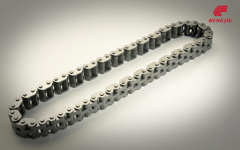 齿形链零件采用优质合金钢材料制造,链板类零件采用精密冲挤工艺成形,等温淬火工艺处理,获得高的硬度、强度和冲击韧性。销轴表面超高硬化处理,具有良好的抗磨损性能。根据链条啮合理论计算并反复验证、修证所形成的链板齿与链轮实现完美的啮合,不仅体现出坚固可靠、适应长时间高速、轻量化等特点,且在高速运转下得到优越的低音效果。