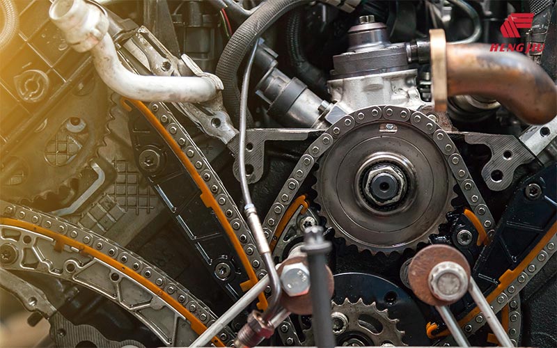 齿形链零件采用优质合金钢材料制造,链板类零件采用精密冲挤工艺成形,等温淬火工艺处理,获得高的硬度、强度和冲击韧性。销轴表面超高硬化处理,具有良好的抗磨损性能。根据链条啮合理论计算并反复验证、修证所形成的链板齿与链轮实现完美的啮合,不仅体现出坚固可靠、适应长时间高速、轻量化等特点,且在高速运转下得到优越的低音效果。